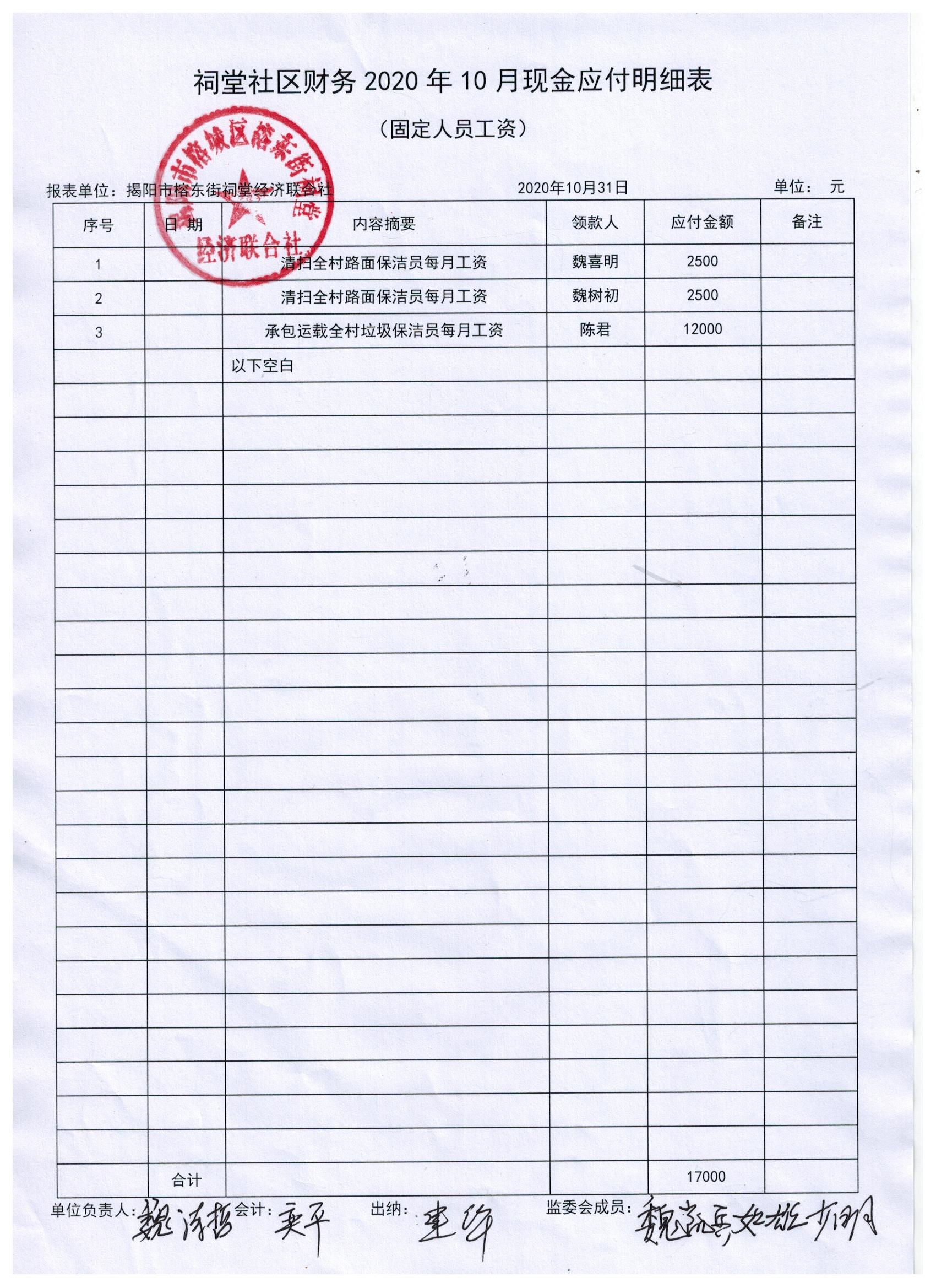 祠堂社区2020年10月现金应付明细表(固定人员工资)